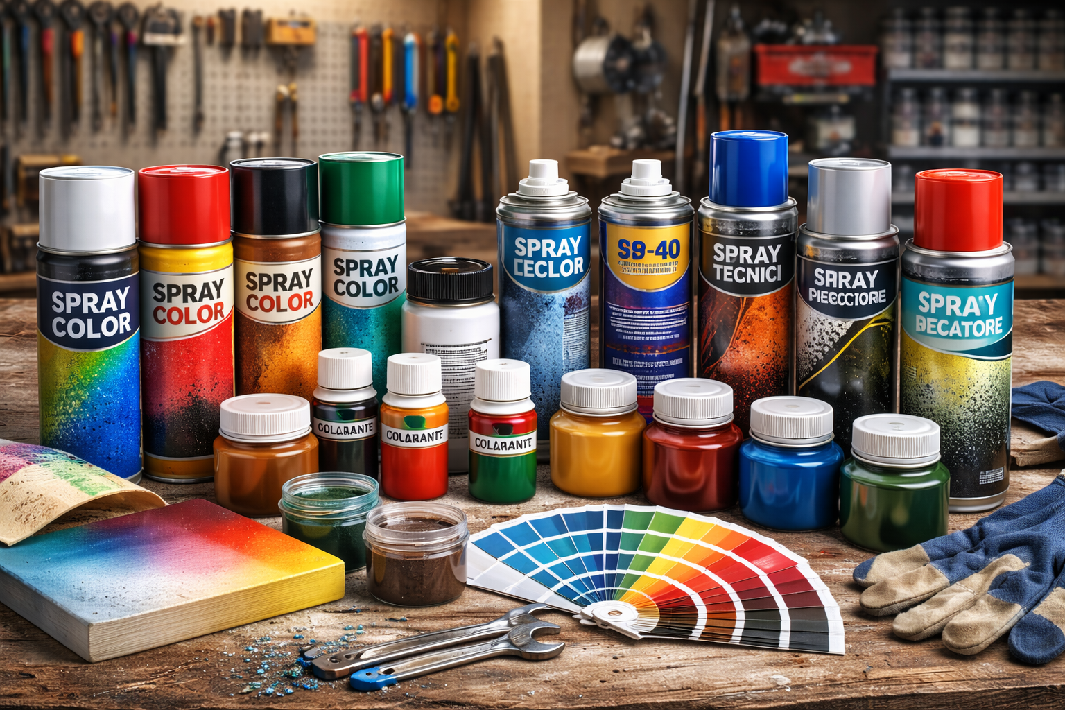 Completano l’assortimento coloranti per personalizzazione delle tinte e spray tecnici professionali, tra cui lubrificanti, sbloccanti, protettivi e detergenti specifici per manutenzione. Prodotti indispensabili per officine, manutentori e imprese che cercano qualità e affidabilità.