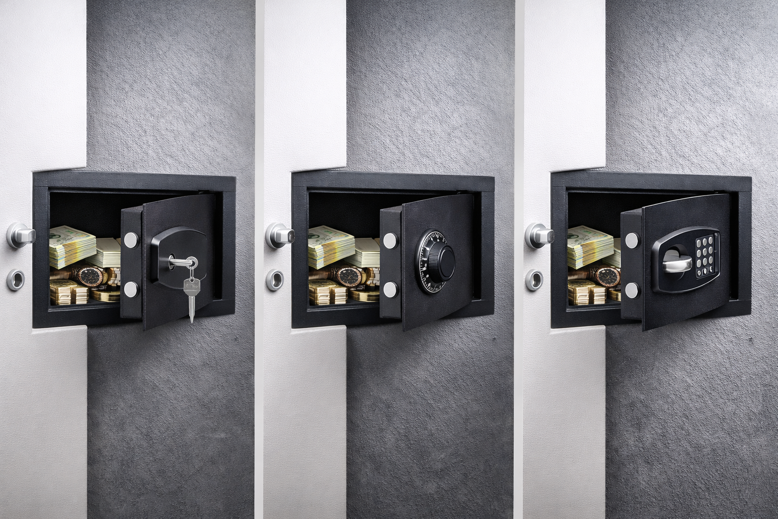 Disponiamo principalmente di cassaforti a muro con apertura a chiave, combinazione meccanica o elettronica, in diverse dimensioni e livelli di sicurezza.